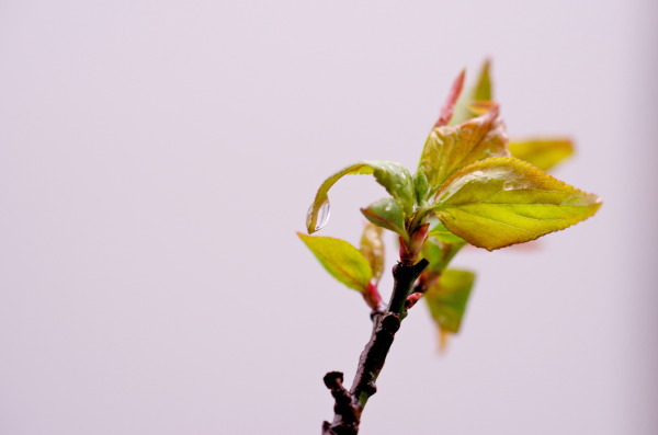 | 4月になりましたね。 昨日の土曜日は春の嵐のようで、東京は物凄い風が吹き荒れて交通機関も麻痺するくらい。 ベランダの盆栽も風で倒れたりしたけれど、なんとか持ちこたえました。 夕方前には風も治まり、薄日が射す天気に。 ということで、雨上がりの梅盆栽の葉にあったレインドロップをマクロでパシャリ。