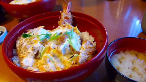少し遅めのランチは、カロリー気にせずカツとじ丼、エビフライもついてます。 なかなかのボリュームと卵とじも甘く、美味しくいただけました。