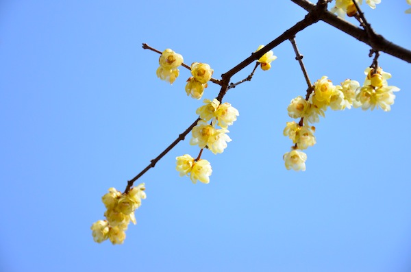 蝋梅という種類の花。読んで字のごとく蝋で作られた花びらのようで薄くて太陽の光を透かしてました。