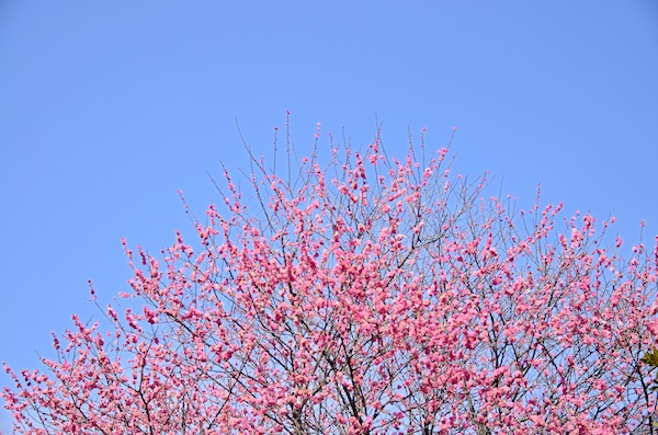 薄紅色の八重寒紅(ヤエカンコウ)という紅梅は満開。咲き乱れるように咲いて、青空に映えました。