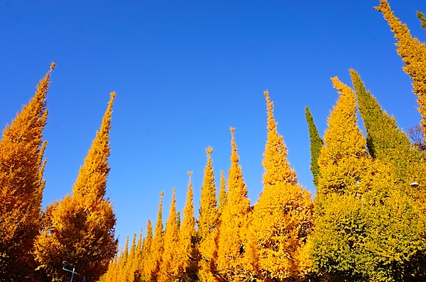 秋空の真っ青な空と赤や橙に色づいた紅葉が眩しい。 イチョウの木下には銀杏がたくさん落ちていて、思わず拾いたくなるも、あの独特なカホリが・・・(^_^;) 銀杏拾いをしているオバチャマに託して、次に向かうは外苑前のイチョウ並木。 ここ数年毎年来ている場所で、今年も沢山の人出があり賑わってました。