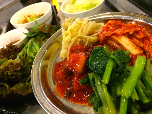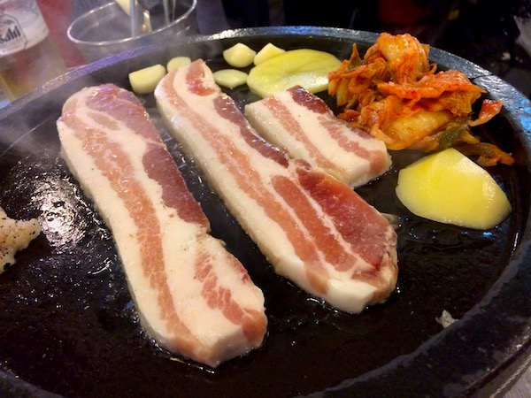 お酒を頼み、キムチとナムルの盛り合わせを摘まみながら、サムギョプサルの出来上がりを待つ。