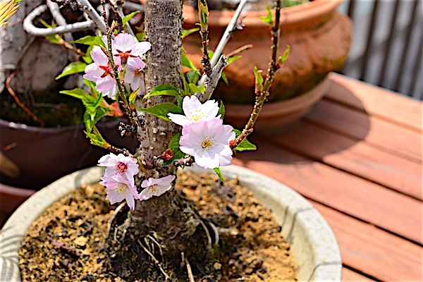 | 我が家の桜盆栽もようやく咲きました。 昨年に比べると花数は少ないですが、嬉しい。 もう少し肥料をあげて来年にはもっと咲かせたいです。