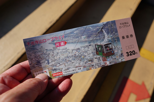 商店街を2つ抜けるとロープウェイ乗り場。 片道乗車券を購入して16:15に出発。