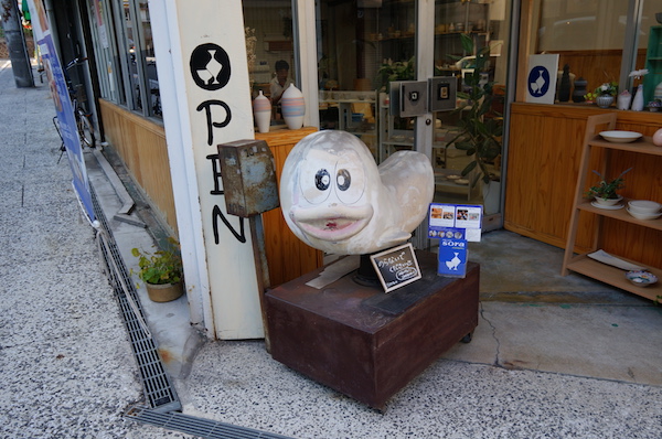再び商店街を歩くと、昔の遊園地やデパート屋上にあったお金を入れてキャラクターが動く乗り物が店先に。 なんともシュールな光景。