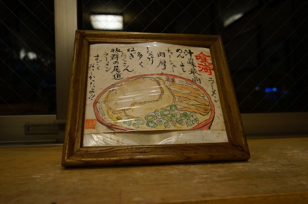 この時点で着ていた服がビショビショだったので、一旦ホテルに戻り、シャワーを浴びて 今日一日撮った写真をカメラからMacに移動させて写真整理。 そうこうしていると夜19時を回ったので、ここら辺のお店は閉まるのが早いので夕食へ出掛ける。 尾道に来たなら一度は食べたい「尾道ラーメン」 入ったお店は「喰海(くうかい)」。 昼間の明るいうちなら尾道水道の景色を観ながら食事がいただけるのですが 入店したのが夜ということで、窓際から見える景色は真っ暗・・・