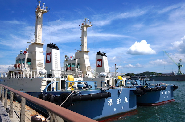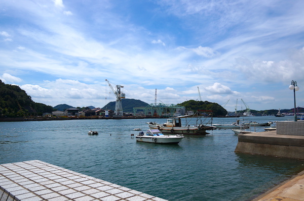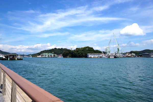 景色を眺めた後は再び高速自動車道に乗って尾道へ。 新尾道大橋を渡り、いよいよ尾道へ入る。 レンタカーを「新尾道駅」のお店へ返却し、駅前からタクシーでホテルへ移動。 ホテルは尾道水道真ん前で、青空に映された碧い海が見え、向こう岸の「向島」には造船所が。 向島と尾道とは渡船が島民の交通手段らしく、頻繁に行き交っていました。