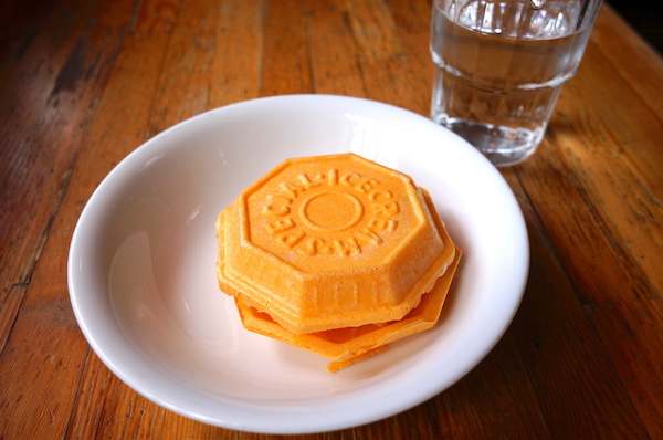 焼き中も引っ切りなしに持ち帰り予約注文の電話が鳴っていて、地元の人が注文するくらいならと期待大。 約30分ほど待った後に出てきたお好み焼きは、まさに「広島お好み焼き」。 サイズは言ってなかったけれど、昨日の「いんおこ」よりもボリュームある大きさ。 ここのお店もお箸は出てこず、小さなコテのみ。 さすがに2回目なので、割と上手に食べこなせたと思う。 なにより、美味しかったし。 食事中、オバチャンと行商のおじいちゃんとの会話を聞いていると、まさにここは広島なんだ と分かるくらい広島弁でした。 なんとなく心地よい感じ。KEとオカンとの会話的なイントネーション。 今回は舌もヤケドせず、無事完食。 その後、食後のデザートとして、お店近くに「からさわ」アイスがあったので そちらでアイスモナカをいただく。
