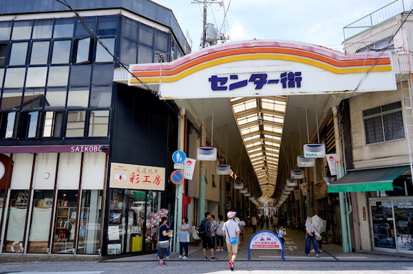 海辺の倉庫を改築したホテルとレストラン、ショップが入る複合施設を散策し 「千光寺山ロープウェイ」まで街の商店街アーケードを散歩しながらの移動。