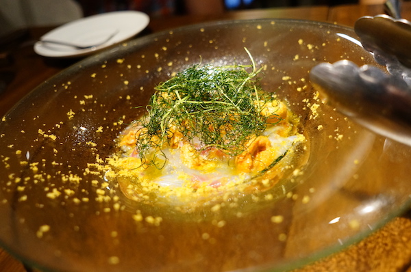ウニのマリネにカラスミがまぶされていて、贅沢な感じの黄金色。