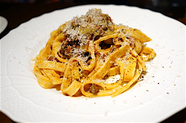 パスタは平打ち麺の生パスタにラグーソースで食感モチモチ。