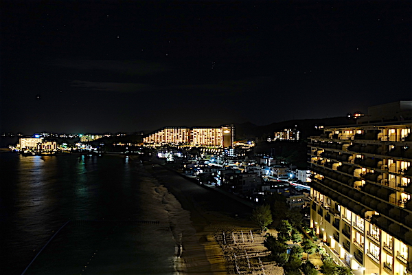 バルコニーからの眺め。夜景がリゾート感醸し出します。 夕食は事前にチェックしていた、ホテル近くの琉球料理「あしびなー」。
