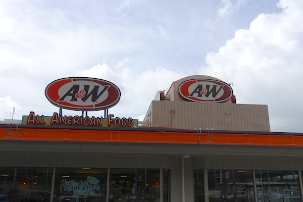風も強くなってきて、いよいよ台風が近づいている感じになり、遅めのランチを摂りに移動。 名護市内まで移動して、沖縄来たらやっぱり「A&W」通称エンダーのハンバーガーとルートビア。
