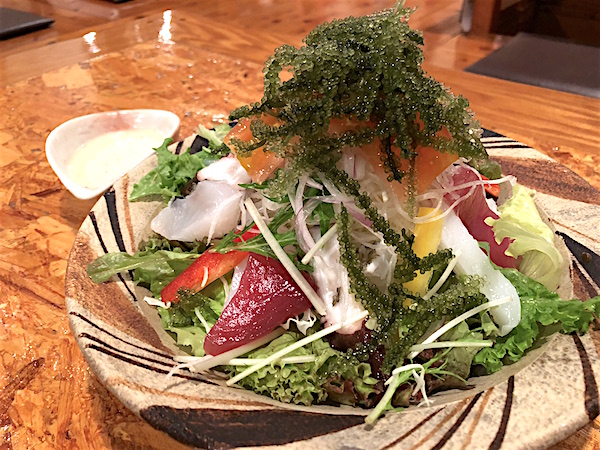 海ぶどうと地元で捕れた海鮮を使ったサラダ。海ぶどうがプチプチして美味しい。