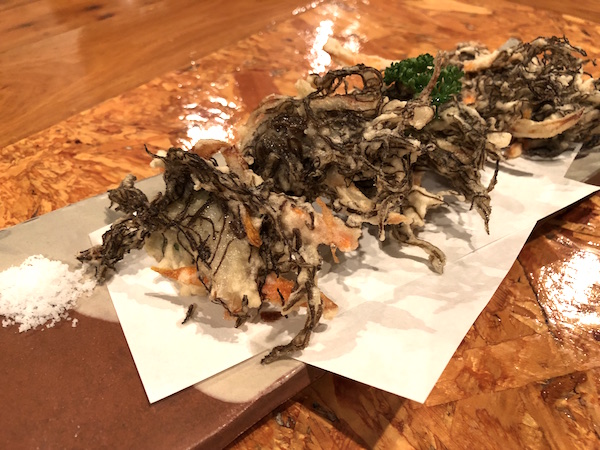 もずくの天ぷらは島まーす(塩)でいただきます。
