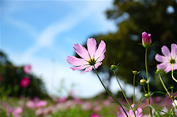 秋といえばススキ。 青と緑、そしてススキの穂。秋ですね~。 園内はこの連休では一番の行楽日和ということか、沢山の人出。 駅前の伊勢丹で軽いランチとしておにぎりを購入して(値段の割に少なげでお高い) 園内でまずは腹ごなし。 みんなの広場ではキバナコスモスが咲き乱れるも、やっぱりコスモスはピンクでしょ。