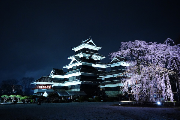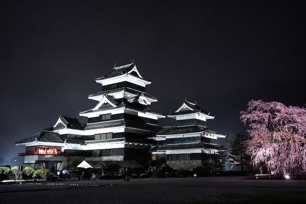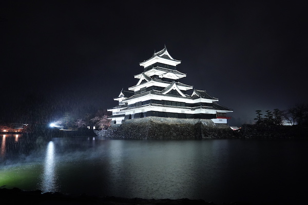 お勘定をして部屋に戻り、温泉があるホテルだったので入湯。 身体も温まったところで、ちょうど今日から松本城のライトアップと「夜桜会」が開催される日だったこともあり 雨がまだ降る中、歩いて松本城へ向かう。