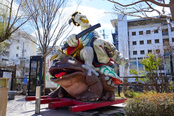 街中まで戻り、「縄手通り」を練り歩く。 昨日の雨の中も歩いたけれど、やっぱり晴れた天気で歩くと気分も変わります。 ここはカエルがシンボルのようで、あちこちにカエルの置物やお土産キャラクターがありました。