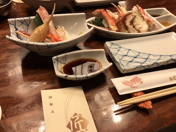 かに会席の「匠」をいただく。 ズワイガニ、タラバガニ、毛ガニの味比べ。 かにの身をほぐして取る作業は無口になるというけれど、本当に黙々とほじほじ。
