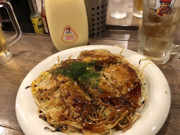 開店すぐだったこともあり、注文してからお好み焼きが出てくるまで少し待たされ その間、ビールと摘みに牛すじ煮込みなどいただく。