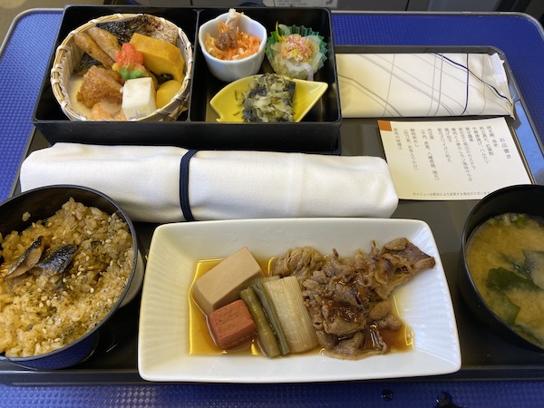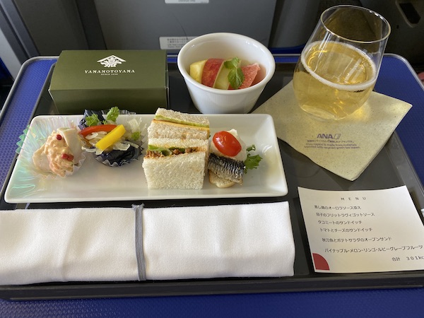 旅程は1日目、那覇市内泊。 2日目、3日目は恩納村泊。 ユッタリ過ごしたかったので、出発は昼過ぎの便で移動。 プレミアムクラスだったのでお昼御飯出ました。なかなか美味しかったし 今回初日は那覇市内に泊まるので、レンタカーは借りず機内でアルコール(シャンパン)もいただく。 やっぱり空の上で飲むお酒は酔いが早くて心地よいです。