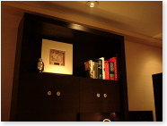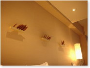 部屋に入ると、和テイスト画をレイアウトしたパネルが壁にならび 奥行き感と落ち着いた雰囲気を感じさせる。 |