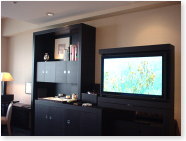壁には大型プラズマテレビやDVD、 ミニバーなどがあり シンプルだが、使い勝手が良い |