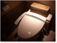 トイレはシンプルに、個室も狭さを感じさせない便座の配置と、 程明るい照明が安心感を与えている。 |