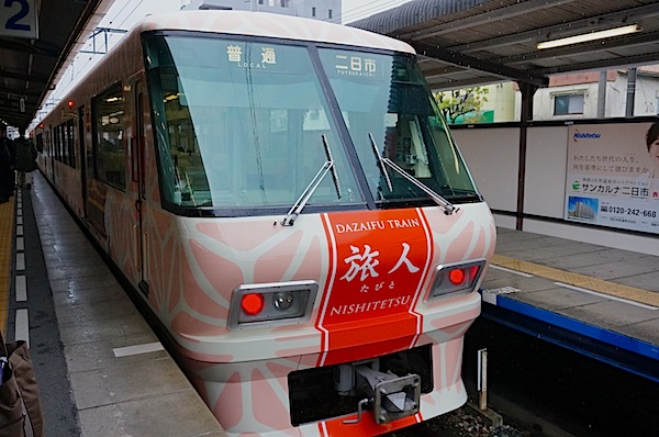 帰りは天神から歩いて博多駅前のホテルまで。 結構歩いたのと、旅の疲れが出たのか、部屋でマッタリとお酒を飲んで、テレビを観て バスタブに湯を張って疲れを癒やして就寝。 朝目覚めると、やっぱり雨xxx 朝食バイキングでお腹を満たして、チェックアウト後は天神までタクシーで移動。 目的は太宰府天満宮。西鉄の駅ホームに観光列車のような特急列車が。 すかさず乗り込み、二日市駅でスイッチバックして乗り換えなく太宰府駅に到着。近い!