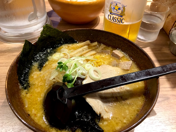 13時過ぎ、無事に新千歳空港に到着して、まずは腹ごしらえ。 空港内の「北海道ラーメン道場」で札幌ラーメンをいただく。 まずはサッポロクラシックなる生ビールをいただき、しばらくすると着丼。